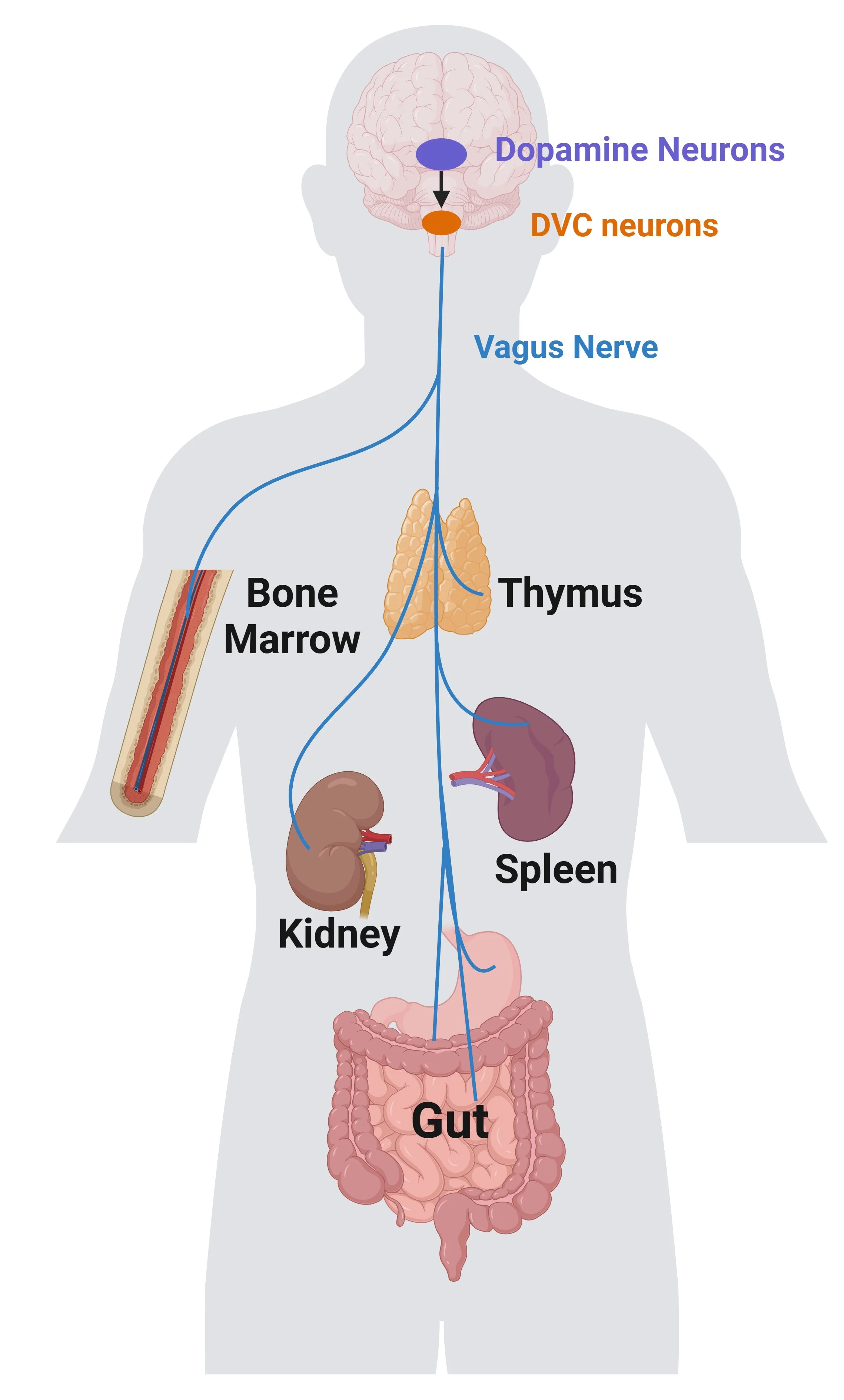 Midbrain Dopamine Neurons as the Command Center for Peripheral Immunity: Imagine midbrain dopamine neurons as a master conductor, orchestrating not only motivation and reward but also immune responses. The Khoshbouei Lab has made groundbreaking discoveries in mapping the precise neural circuits through which dopamine neurons in the midbrain communicate with the immune system, particularly the spleen, a critical immune organ. Using Cre-dependent viral tracers and chemogenetic approaches, the lab has traced a brain-to-body pathway. Our research shows that dopamine neurons project to the dorsal vagal complex (DVC), a key brainstem region that acts as a relay station for neural signals to peripheral organs, such as lung, gut, heart and spleen. Signals from the DVC are then transmitted through the celiac ganglion to the spleen, influencing immune cell populations and overall immune function. This pioneering work sheds new light on conditions where both the nervous and immune systems are dysregulated, such as Parkinson’s disease (PD), methamphetamine addiction, and neuroimmune disorders. While dopamine’s role in CNS function is well known, these findings provide critical insights into its underexplored influence on immune regulation.